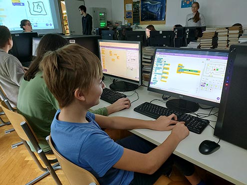 15. 10. 2025 |V petek, 10. 10. 2025, smo za učence OŠ Ledina pripravili delavnico programiranja v scratchu. Pod vodstvom profesorice za informatiko, Betke Burger, in ob pomoči dijakov 3. f in 3. g so osnovnošolci izdelali svojo prvo računalniško igro – labirint, ki ga je moral premagati pajek, da je prišel do kačjega pastirja.